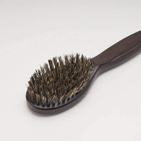 天然豬鬃毛嵌入觸感光滑的山毛櫸木中,它對容易受損的角質層很溫和。沒有使用天然橡膠,而是將猪鬃毛直接嵌入木材中,這樣形狀更簡單,也更不容易損壞。山毛櫸部分呈深灰色,適合男性和女性。為了與木材的顏色相匹配,刷毛採用黑色和白色的混合。刷子表面是平的,因此對皮膚很溫和。